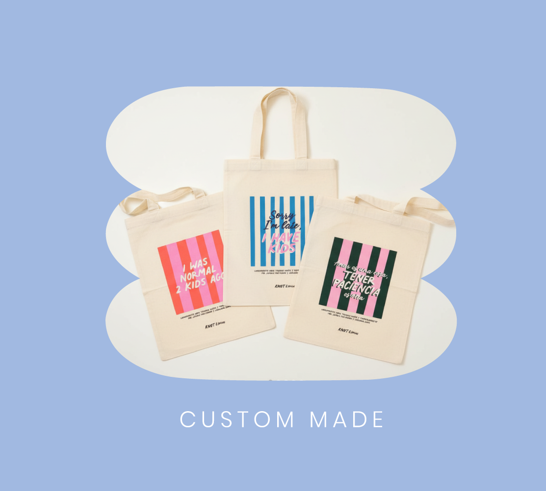 En Knot & Stories creamos piezas 100% a pedido: totes, estuches y accesorios personalizados según el diseño, tamaño y modelo que tú quieras. Tú imaginas, nosotras lo hacemos realidad.